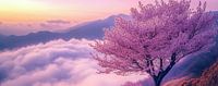 De boom lijkt haast te zweven boven een dikke laag van wolken, die zich als een zee uitstrekt tot aan de horizon. In de verte rijzen bergen op, gehuld in een zachte nevel die het geheel een etherische sfeer geeft. De…