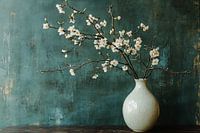Dit ontwerp straalt een serene eenvoud uit en combineert natuurlijke schoonheid met klassieke elegantie. De bloesemtakken, kunstzinnig gerangschikt in een prachtige geglazuurde keramische vaas, worden gepresenteerd tegen een rustgevende blauwgroene achtergrond. Het geheel ademt verfijning en is perfect voor elk interieur dat een vleugje natuur en stijl verlangt. De zachte kleuren en harmonieuze compositie maken dit werk ideaal voor een woonkamer of eetkamer, waar het een tijdloze sfeer toevoegt. Dit ontwerp is niet alleen decoratief maar ook rustgevend, een perfecte keuze voor liefhebbers van minimalistische en klassieke stijlen.