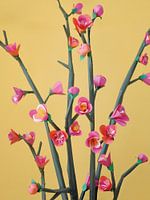 Papieren bloesemtakken met roze bloemen tegen een gele achtergrond.