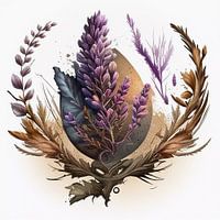 Een prachtig samengesteld arrangement met een centrale groep delicate paarse bloemen omringd door takken en bladeren in aardse tinten. Het subtiele contrast tussen gedempte groene tinten en lavendelkleurige bloemblaadjes creëert een elegant, harmonieus beeld dat perfect is voor op de natuur geïnspireerde decoraties en verfijnde…