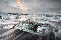 Onderscheidend ijsblokje op een zwart strand met sterke branding, sporen van beweging van het afwaterende water op het donkere zand, op de achtergrond meer ijsblokken, golven die naar binnen rollen, contrasterende lucht met wolken en wat kleur - Locatie: IJsland, Jökulsarlon (Jökulsárlón)