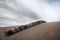 Lood zware betonblokken netjes op een rijtje bovenop een dijk. Gefotografeerd in de buurt van Neeltje Jans. Achter de dijk ligt een natuurgebied waar vele zeevogels nestelen. De betonnen rij maakt het gebied minder toegankelijk want het grenst achter de dijk aan een dichte bossage van vlier en bramen. Je ziet het niet aan deze foto maar…