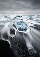 IJsblokken in blauwe tinten op een zwart strand met sterke branding, de beweging van het water is te zien (lange belichting, duidelijke sporen van beweging), boven een contrasterende grijze bewolkte lucht, dieptewerking door perspectief - locatie: IJsland, Jökulsarlon (Jökulsárlón)