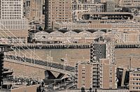 Een Blokliner is een bewerking van een foto waarbij een zwart-witversie wordt gecombineerd met een steunkleur, en afgewerkt met een witte lijntekening. In deze Blokliner zien we de Nieuwe Maas en de Wilhelminapier met onder andere gebouw De Rotterdam, de Cruiseterminal en Las Palmas. Op de voorgrond het Leuvehoofd, op de achtergrond Katendrecht. En links uiteraard een deel van de fameuze Erasmusbrug