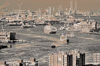 Een Blokliner is een bewerking van een foto waarbij een zwart-witversie gecombineerd wordt met een steunkleur, en afgewerkt met een witte lijntekening. Op deze Blokliner zien we druk scheepvaartverkeer op de Nieuwe Maas, met op de achtergrond de havens en industrieën van Pernis, Botlek en Europoort en op de voorgrond de woontorens van de wijk Schiemond
