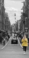Ze liep zo mijn beeld in toen ik de Hartenstraat in Amsterdam wilde fotograferen. Nu is ze vereeuwigd, de blonde jongedame in haar parmantige gele jasje. Ze staat er 'gekleurd' op, op deze zwart-wit foto.