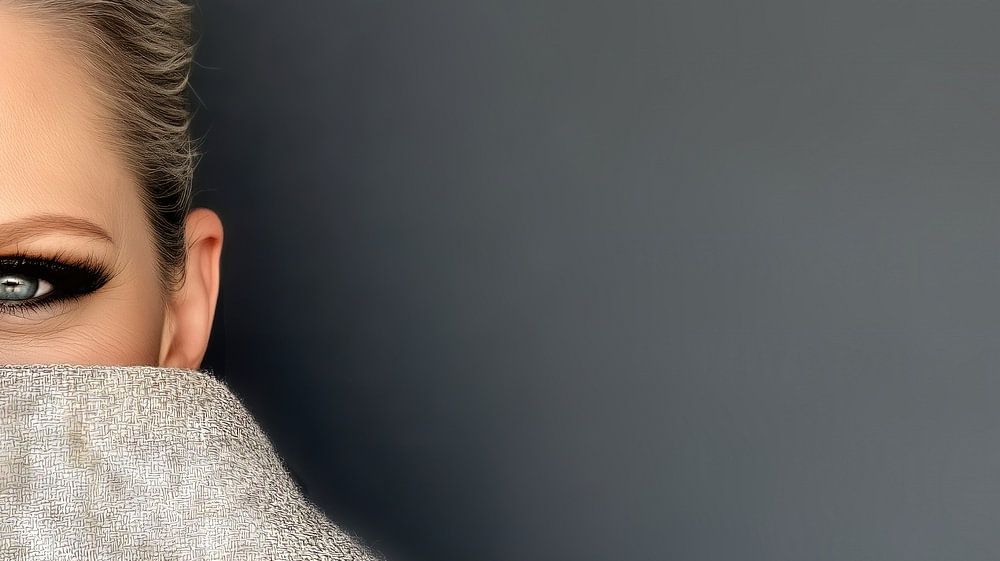 Een blonde vrouw met opvallende make-up bedekt haar mond met een glinsterende zilveren sjaal. Alleen haar expressieve ogen blijven zichtbaar en trekken de blik van de kijker. De grijze achtergrond versterkt de elegante en mysterieuze sfeer.
