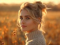 Een dromerige close-up van een blonde vrouw, badend in het warme, gouden licht van het gouden uur. Haar zijdezachte lokken vangen de zonnestralen, waardoor ze bijna gloeien. Haar huid straalt met een zachte, natuurlijke glans. Haar ogen reflecteren het warme licht, gevuld met een serene, dromerige blik. De achtergrond is onscherp, met…