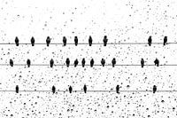 Zwart wit foto kunst, vanuit je raam kijken naar spreeuwen op een draad in de regen.