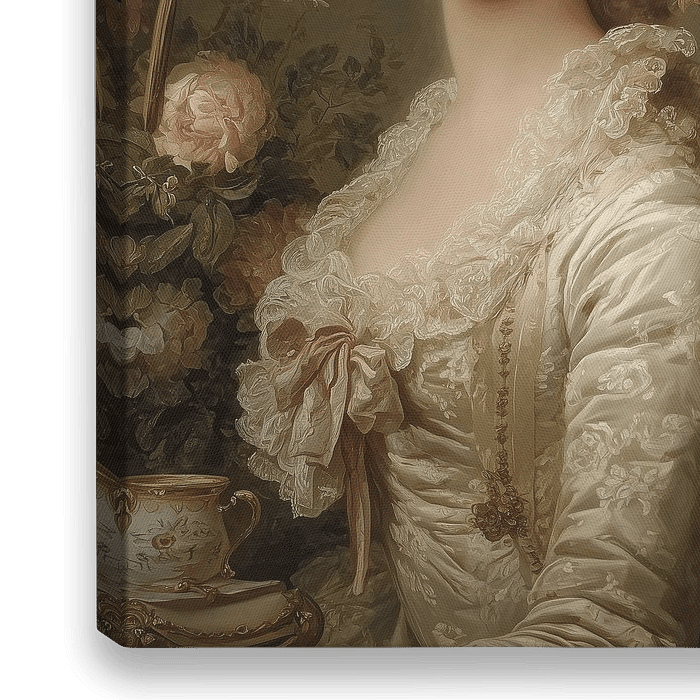 Technisch is dit een schilderij waarin kleur en ritme samenspelen: zachte pastellen in de bloemen contrasteren met het diepgroen van de achtergrond, en gouden accenten in de juwelen en theeset geven kleine glinsteringen die hetoogmeeneemtlangshetbeeld.Hetiseenvrouwschilderijdatnietalleeneengezichttoont,maareenideeuitlegt:gezichtalslandschap,kledingalspodium.Hetwerktgoedalsbloemenschilderijénalsportretschilderij—mensendiezoekenop"vrouwschilderij"of"bloemenschilderij"zullenpreciesvindenwatzeverwachten:eenportretwaardemenselijkeaanwezigheidversmeltmetbotanischerijkdom.