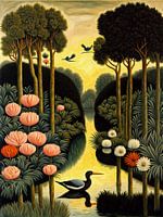 'Bloom Lagoon' uit de serie 'Magische Landschappen' toont een levendig en serene waterpartij tijdens het gouden uurtje omgeven door weelderige tropische begroeiing, kleurrijke bloemen en exotische vogels. Dit schilderij, net als de rest van de serie, neemt je mee naar een surrealistische wereld waar de natuur op haar meest magische manier tot leven komt. Met een dromerige sfeer, levendige kleuren en gedetailleerde patronen, straalt deze landschapskunst een gevoel van rust en verwondering uit. Elk kunstwerk uit deze serie biedt een uitnodiging om te ontsnappen aan de werkelijkheid en te verdwalen in een paradijselijke omgeving vol leven en schoonheid. Deze tropische schilderijen zijn perfect voor liefhebbers van surrealistische landschappen en kleurrijke natuurkunst. Of het nu gaat om een schilderij van een glooiende heuvel, een zonovergoten strand of een uitgestrekte woestijn, elk artwork in de serie 'Magische Landschappen' belooft een betoverende ervaring. Ontdek de magie van deze exotische kunstwerken en breng een stukje droomachtige natuurkunst in huis. Ideaal voor iedereen die houdt van tropische kunst en unieke landschappen.
