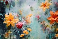 Kleurrijk werk met bloemen in de hoofdrol met de titel: "Bloom baby, bloom!" Met dit werk aan de muur hoef je nooit meer verse bloemen in huis te halen of water te verversen. Hier word je toch blij van?
