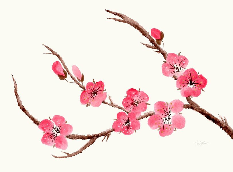De kersenbloesems verschijnen in een zacht ritme, alsof ze worden bewogen door een zacht briesje. De compositie vormt een evenwicht tussen stilte en beweging en legt de levendige essentie van de lente vast. Dit met de hand geschilderde werk, met zijn subtiele kleurvariaties, brengt een gevoel van rustige energie in verfijnde interieurs.