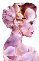 De afbeelding lijkt een dubbel belicht portret van een vrouw met roze bloemen in haar haar. De kunststijl is digitaal, en de vrouw lijkt te bestaan uit bloemblaadjes, wat de indruk geeft van een gestileerde, etherische schoonheid. De algemene toon van het portret is romantisch en artistiek, waarbij het gebruik van bloemen en de dubbele belichtingstechniek bijdragen aan de droomachtige kwaliteit van het beeld.