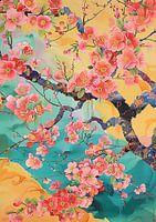 Kersenbloesems, in levendige kleuren, met details die de bloesems tot leven brengen. Het ontwerp is gedurfd, met gelaagde patronen die diepte en complexiteit toevoegen aan het geheel. de kersenbloesem, ook bekend als sakura in het Japans, staat symbool voor vergankelijkheid, schoonheid en de lente. In Japan wordt de bloei van de kersenbloesem (sakura) elk voorjaar uitgebreid gevierd tijdens de hanami (bloemenkijk) festivals, waar mensen samenkomen om te genieten van de prachtige bloesems. De korte bloeiperiode van de kersenbloesem wordt vaak geassocieerd met de vluchtigheid van het leven en herinnert mensen eraan om de schoonheid van het moment te waarderen.