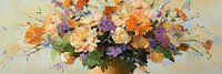 Blooming Contrast - Dit bloemen schilderij toont een levendige verzameling van dik aangebrachte bloemen in oranje, paars en gele kleuren, opvallend gerangschikt tegen een zachte, warme achtergrond.