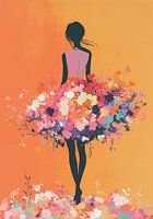 "Blooming Silhouette" vangt een vrouw van achteren, tegen een achtergrond van warme oranje en gele tinten. Haar antracietkleurige silhouet vormt een krachtig contrast met de levendige achtergrond, terwijl ze elegant in beweging is. Ze draagt een roze topje en een jurk die in impressionistische stijl is versierd met een explosie van kleurrijke bloemen. Deze bloemen lijken de jurk te omarmen, waardoor een kleurrijk en vrolijk effect ontstaat. De combinatie van de kleurrijke bloemen en de subtiele kleuren van de achtergrond creëert een visueel feest, waarin de vrouw opgaat in een weelderige bloeiende fantasie.