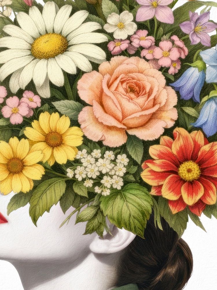 deels verborgen achter een veldboeket van o.a. zachtroze lelies tot levendige dahlia’s.
