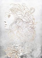 Aquarel schilderij in grijs,zilver en goud tinten, mixed media portret van een vrouw met bloemen
