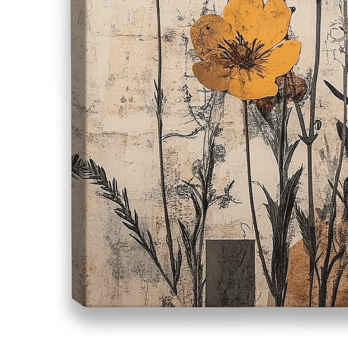 Blooms in Collage - Dit bloemen schilderij toont een reeks statige bloemen, waaronder een felgele bloem en een zachtroze exemplaar, tegen een achtergrond van gemengde media met zichtbare collage-elementen en abstracte vormen.