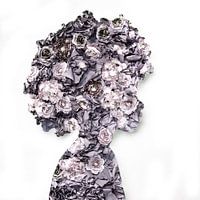 Collage, silhouet van meisje gemaakt van rozen uitgeknipt op papier in lila en paars tinten