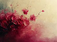 Het schilderij straalt zachtheid en elegantie uit met een palet van roze en witte tinten. Tussen de vloeiende penseelstreken ontvouwen zich subtiele bloesem bloemen, als fragiele accenten in een abstracte omgeving. De bloesems lijken haast te zweven, vervlochten met de achtergrond, als een lentebries gevangen op doek. De verf is licht…