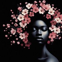 Het portret van een prachtige vrouw met een kapsel vol met bloesem.