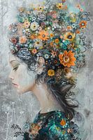 Blossom Nebula - Dit vrouwen schilderij toont een vrouw met een levendige bloemenkroon die gemengd is met surrealistische elementen en natuurlijke texturen in een droomachtige compositie.