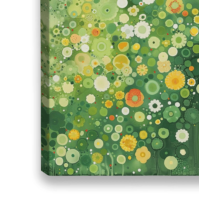 Blossom Spectrum - Dit abstracte schilderij toont een levendige compositie van overlappende cirkels en bloemachtige vormen in een scala van groene, gele en oranje tinten die het gevoel van een weelderige lenteweide oproepen.