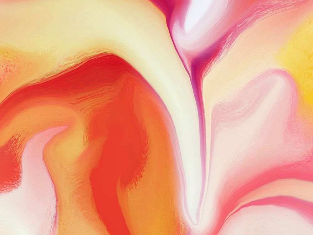 Abstract digitaal schilderij in heldere roze-, koraal- en lichtgele tinten met vloeiende, draaiende vormen. De frisse kleurverlopen en zachte overgangen geven het werk een licht en energiek karakter.