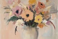 Blossom Whispers - Dit bloemen schilderij toont een levendige vaas vol met los geschilderde, kleurrijke bloemen, waar roze en geel de overheersende kleuren zijn in een impressionistische stijl.