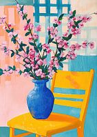Een gouache schilderij met roze kersenbloesems in een blauwe vaas op een gele stoel, met een lichte pastelkleurige achtergrond in perzik- en groenblauwe kleuren en krachtige penseelstreken. De stijl is geïnspireerd op het werk van Henri Matisse.