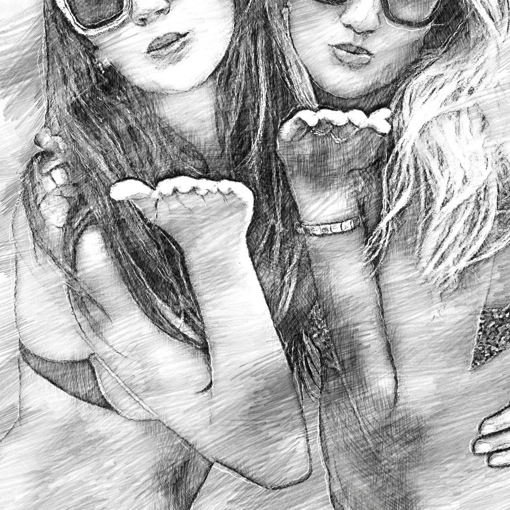 Zwart-wit tekening, gemaakt van potlood en houtskool, van 2 handkussende vriendinnen in bikini.