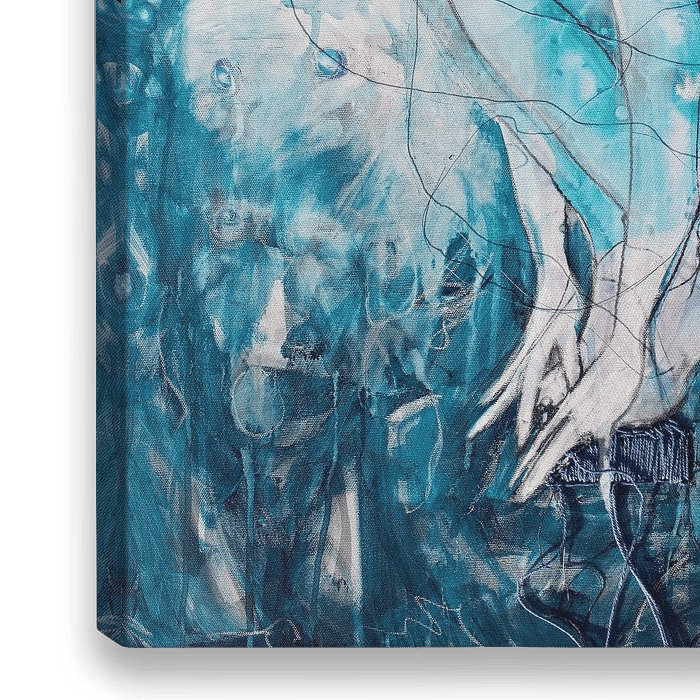 Een figuratief abstract schilderij in vele kleuren blauw van verschillende materialen. er is gebruik gemaakt van acryl, draad, touw & kralen.