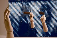 Fotografie, collage en grafische bewerking in sepia en blauw.