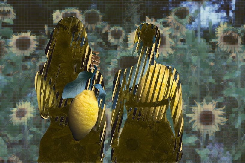 Fotografie, collage en grafische bewerking in geel en blauw.