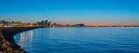 De allure van Reykjavik tijdens het magische Blauwe Uur is te zien in deze adembenemende panoramafoto. Genomen vanaf het uitkijkpunt van Sæbraut, biedt dit fascinerende beeld een weids uitzicht op de skyline van Reykjavik terwijl deze zachtjes overgaat van dag naar nacht.