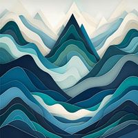 Dit abstracte kunstwerk toont een gestileerde bergketen in verschillende tinten blauw, groenblauw en wit. De bergen zijn afgebeeld als overlappende, golvende lagen, waardoor een gevoel van diepte en beweging ontstaat. Het kleurenpalet roept een gevoel van rust en de natuurlijke schoonheid van berglandschappen op, terwijl de abstracte…