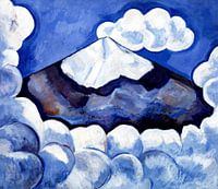 Een landschapsschilderij met bergen en wolken in zachtblauwe kleuren.