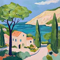 Blue Oasis Calm - Dit landschapsschilderij toont een idyllische Mediterrane kustlijn met een dorpje, omgeven door dichte vegetatie en azuurblauwe zee.