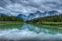 Prachtige reflectie van de bergen en bomen in het kalme meer. Ook de visarend in de bomen zie je in het water terug. Stilte voor de storm, want zoals te zien aan de wolken volgde een stevige bui die de reflectie verstoorde.