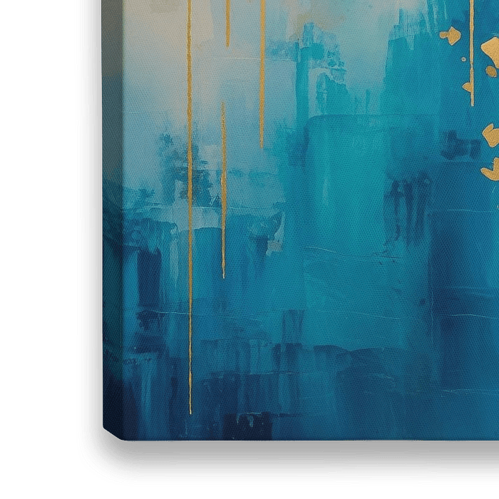 Abstract schilderij blauw en goud. De gouden bloemblaadjes lijken te "regenen" op de onderliggende lagen van het schilderij, wat doet denken aan de gouden regen boom met zijn lange hangende bloemtrossen. De verflijnen die naar beneden stromen, geven een gevoel van beweging en dynamiek. Er is een etherische, dromerige kwaliteit aan het schilderij dankzij de combinatie van de fonkelende gouden elementen tegen de rustgevende blauwe achtergrond.