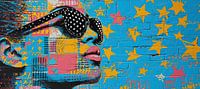 Blue Star Gaze - Je ziet direct twee dingen die je aandacht pakken: een vrouwelijk profiel in close-up met een grote, opvallende zonnebril en een achtergrond die één veld van felgele sterren op blauw is. Het gezicht staat links in beeld, bijna als een muurmozaïek opgebouwd uit vlakken en lijnen; de zonnebril is groot, zwart met witte…