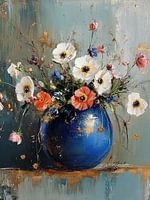 Blue Vase Blooms - Dit bloemen schilderij toont een levendige verzameling van kleurrijke bloesems uitgestald in een glanzende kobaltblauwe vaas, geaccentueerd door ruige verftoetsen en een zachte achtergrond.