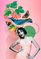 Maak kennis met "Blue Bird on a Pink Day", een kleurrijk staaltje wandkunst van Postergirls dat de grens opzoekt tussen vintage glamour en moderne collagekunst.