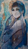 Een figuratief schilderij van verf & blauw draad, een voorstelling van een vrouw met elementen van vervreemding. Deze ontstaan tijdens het proces.
