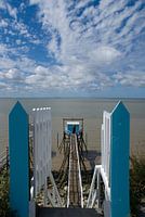 Lichtblauwe carrelet ( visserhut) aan de Franse westkust, dieptefoto met wolkenlucht. Voor een vrolijke vakantiesfeer.