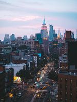 Afbeelding vanaf een rooftop bar met uitzicht over de Bowery en Midtown Manhattan met de iconische Empire State Building op de achtergrond.