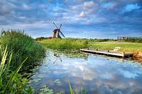 Typisch Nederlands beeld - een molen door de rivier en de mooie blauwe hemel weerspiegeld in het water tijdens de zomer 's morgens. Groningen. Nederland