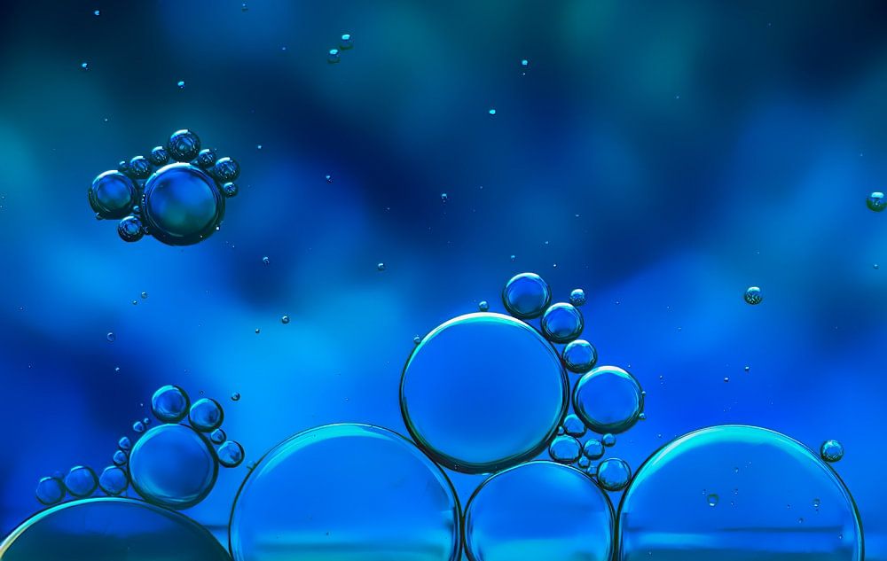 Op deze foto zijn bolletjes olie die op water drijven te zien